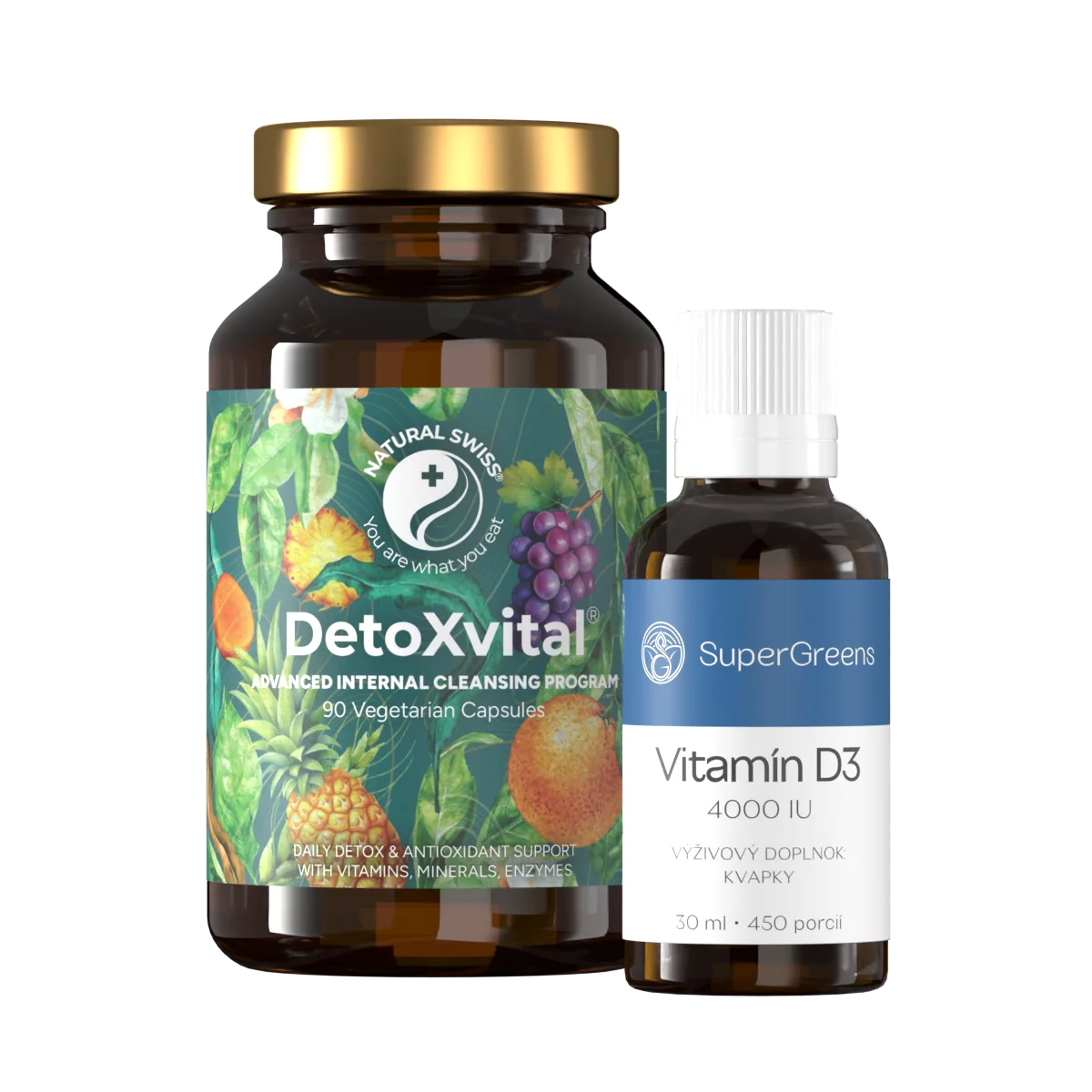 Imunitní duo – kapky s vitamínem D3 a DetoXvital, kapsle s jedinečným složením bohatým na vitaminy, minerály a rostlinné extrakty