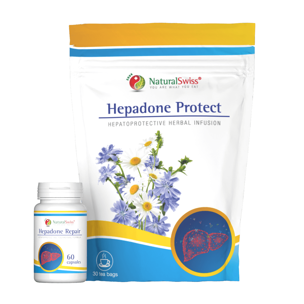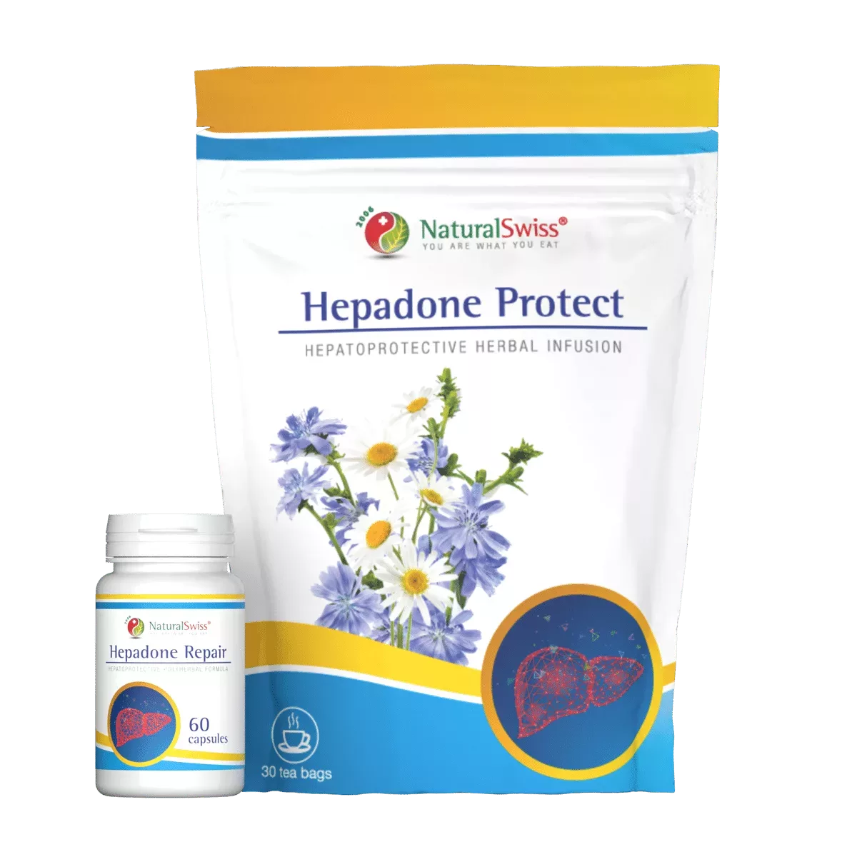 Dvoufázový přístup: kapsle Hepadone Repair s bylinnými extrakty pro ochranu a obnovu jaterní tkáně a bylinný čaj Hepadone Protect pro každodenní jemnou podporu detoxikačních procesů.